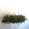 Centerpiece arrangement decorated with 3 candles and festive berries and greens