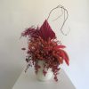 A beautiful sculptural arrangement with a selection of pink dried flowers in a modern white metal vase. We love its softness and playfulness!